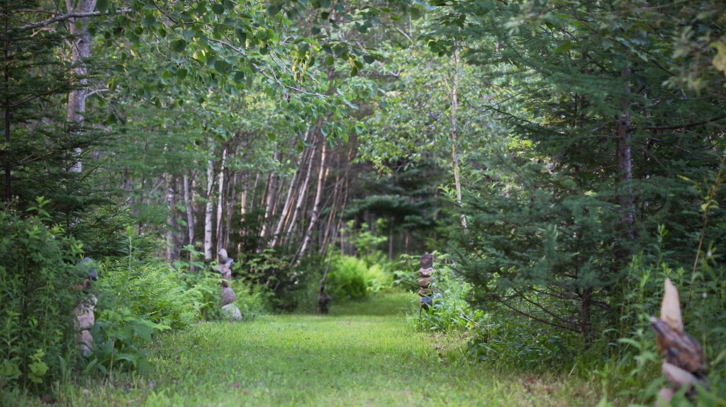 sentinels lining the walk as far as Grandfather Hemlock. They feel like gatekeepers for the forest, somehow protective, standing guard. Their sense of stillness and solidity adds a kind of solemnity as sacred observers, bearing witness and holding the space for me to go through whatever I need to go through. The fact that they do occasionally topple over and need rebuilding reminds me that nothing is permanent, everything keeps changing, and I will always have to keep picking up some metaphorical rock or other and figure out how to re-build, scratching my knuckles and bruising my toes now and then. I have learned overall that that is a good thing. Maybe it’s a little message about resilience.