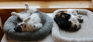 Having spent the previous year pretty sleep-deprived and at the end of my rope due to this cat, I was happy that last winter he seemed to settle in and didn’t fuss about getting out at night. I thought, “Yay, he’s 10 now, maybe as a senior he’ll mellow-out and I can sleep again!” He even cuddled between us on the bed, although it seemed he really had his eye on Alfie Dog for snuggles rather than us. She, however, is wary of cats, having been smacked on the nose once too often I guess, so if Charles came her way she’d do an about-face and show him her butt. He proved, however, quite content to nestle his head into her fluffy tail and fall asleep.